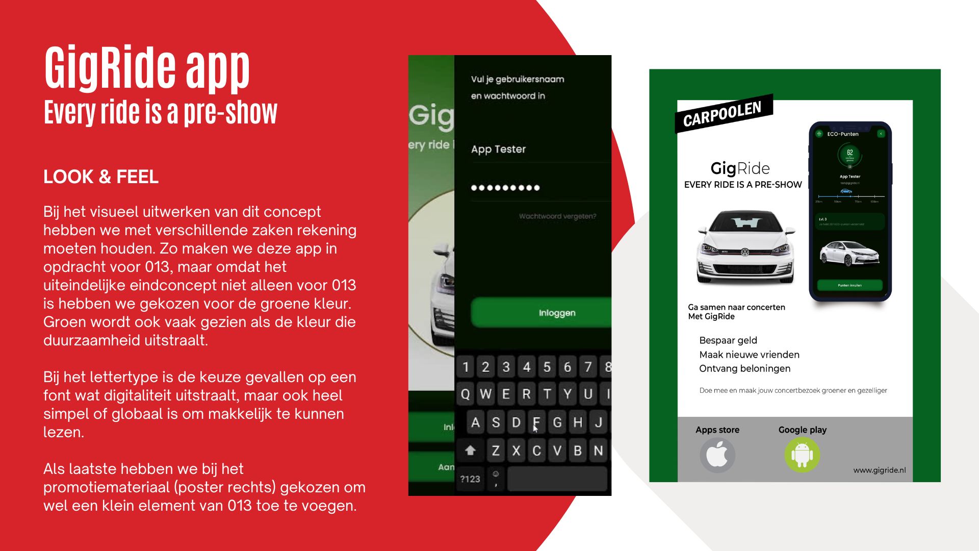 Het resultaat was het concept 'GigRide', een app die carpoolen rond evenementen leuk, sociaal en aantrekkelijk maakt. In de app kunnen bezoekers ritten aanmaken, meerijden met anderen, chatten, reviews geven, hun reisgeschiedenis bijhouden en eco-punten verdienen. Deze punten zijn inwisselbaar voor duurzame beloningen, zoals een gratis hardcup of korting bij partners. Het uitgangspunt: ''Every ride is a pre-show'' de ervaring begint al onderweg.